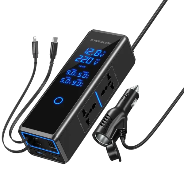Powerology Power Inverter Car Charger [150W AC Output], PD 30W & QC [2 × USB-C, USB-A] Ports, Fast Charge With Unique Cup Fit Design, for Laptop, Smartphones, Tablet, Power Bank, Flashlight, Camping