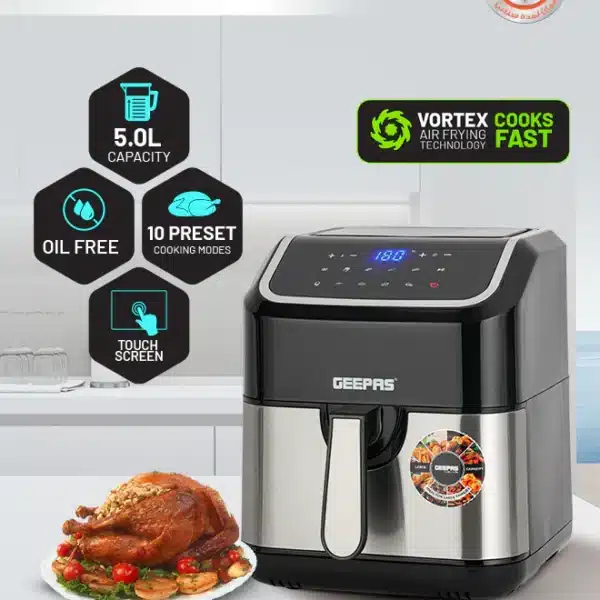 Geepas Digital Air Fryer- GAF37527UK/5.0 L Pot, with Vortex Technology/Digital Display, Touch Screen, Multiple Function, 1-60 Min Timer, Temperature 50-200 Degree Celsius
