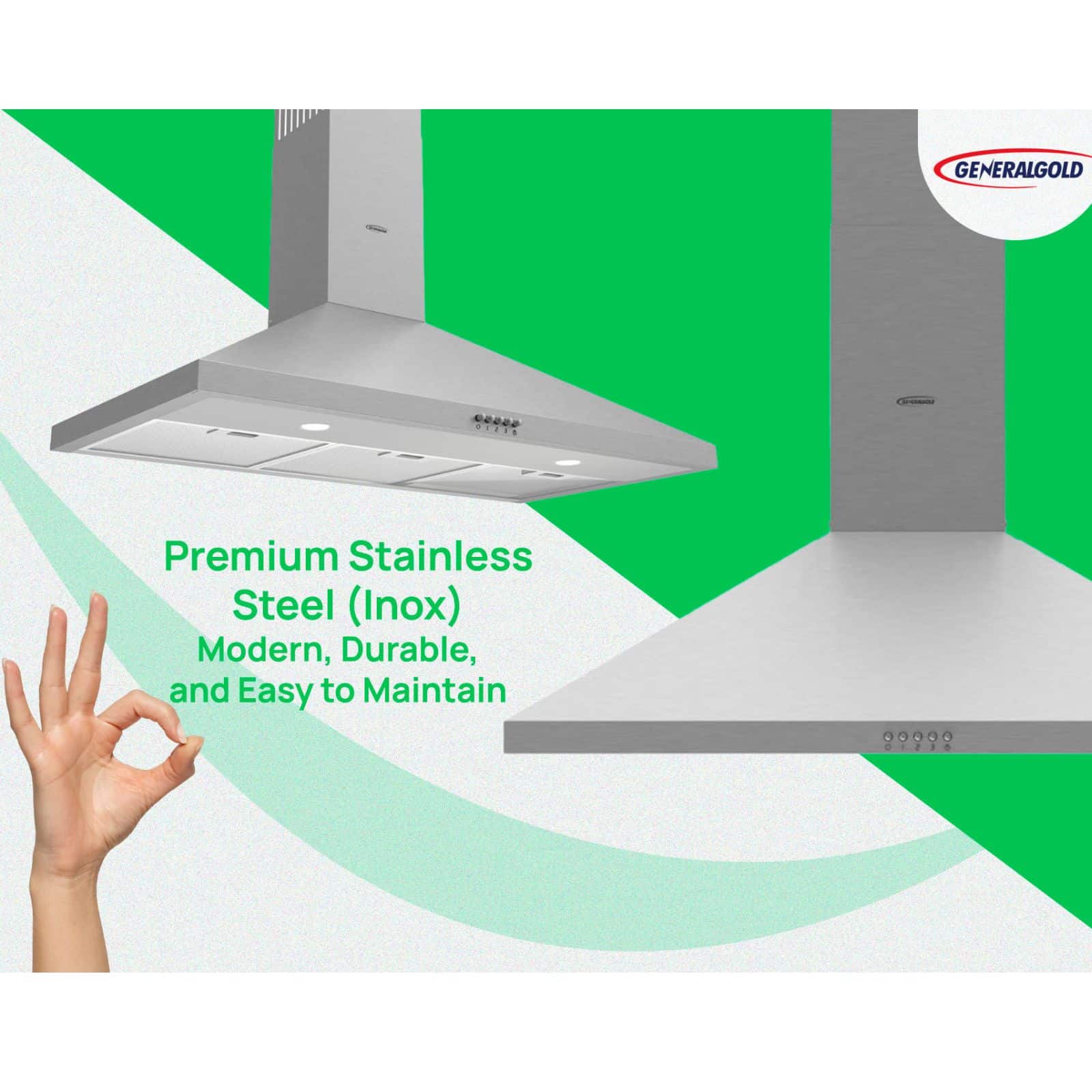The General Gold 90cm Stainless Steel Wall-Mounted Cooker Hood is engineered for homes that demand powerful performance with sleek aesthetics.