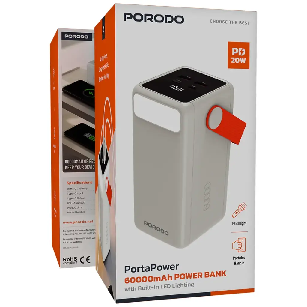 Porodo PortaPower 60000mAh Power Bank with Built-In LED Lighting – White
