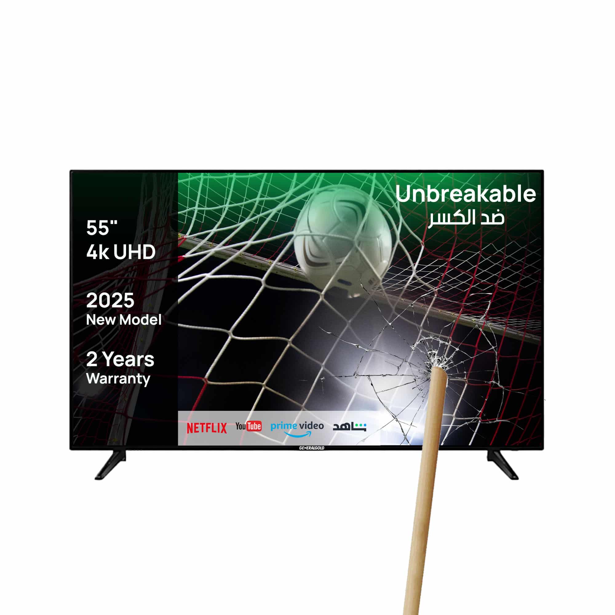 تلفزيون جنرال جولد الذكي بنظام أندرويد، مقاس 55 بوصة، بدقة 4K فائقة الوضوح (2025) – زجاج غير قابل للكسر، مزود بتطبيقات نتفليكس/أمازون برايم/شاهد مدمجة، وذاكرة تخزين 8 جيجابايت
