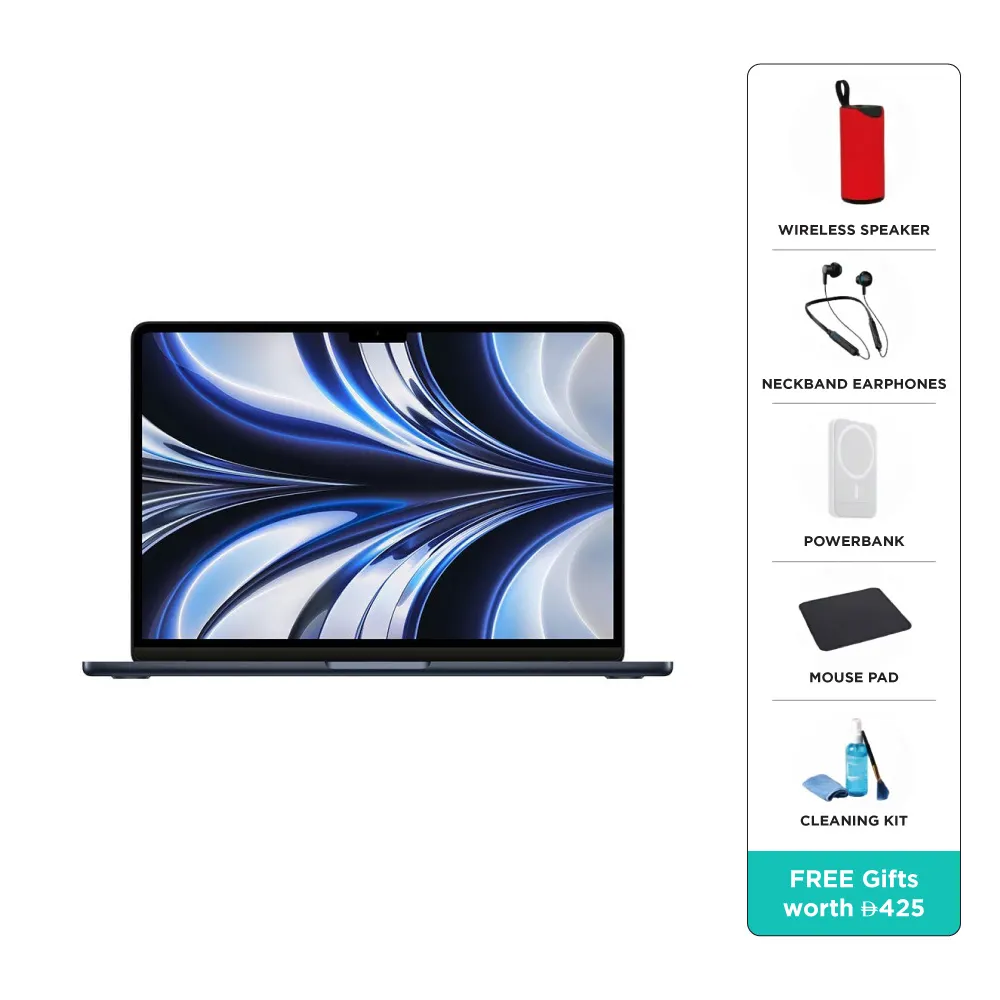 جهاز ماك بوك إير من أبل مقاس 13 بوصة مزود بشريحة أبل M2 مع معالج ثماني النواة ووحدة معالجة رسومات ثمانية النواة، وذاكرة وصول عشوائي 16 جيجابايت وقرص صلب SSD بسعة 256 جيجابايت، باللون العربي -لون منتصف الليل