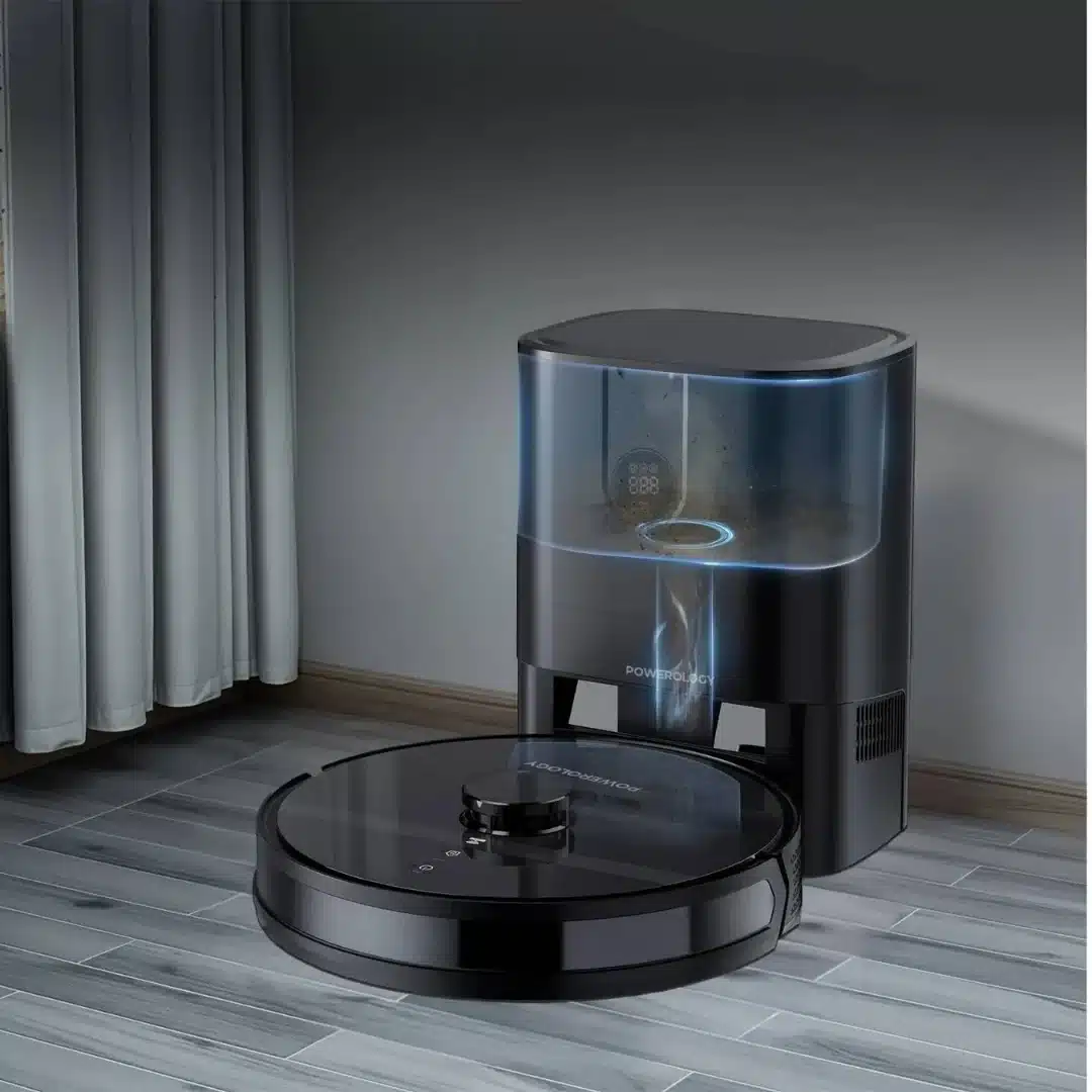 روبوت مكنسة ومسح من باورولوجي سمارت ستيشن، ملاحة ذكية، محرك بدون فرش، قوة شفط، محرك قوي وشفط – أسود