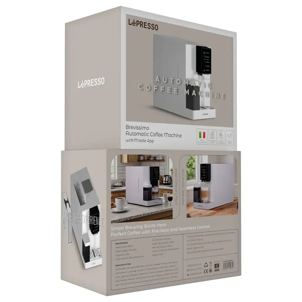 مع ماكينة قهوة Lepresso الأوتوماتيكية المزودة بتطبيق جوال، يمكنك الاستمتاع بجودة قهوة المقاهي في المنزل. هذه الماكينة موجهة لجمهور من عشاق القهوة المميزين للغاية، وهي مزودة بمحرك قوي جدًا بقدرة 1480 واط يعمل على 220-240 فولت/50 هرتز، مما يوفر مضخة إيطالية قوية بضغط 19 بار. يتيح تصميم الغلاية المزدوجة تحضير الإسبريسو ورغوة الحليب في نفس الوقت – دون الحاجة إلى الانتظار. بفضل خزان المياه الكبير بسعة 1200 مل وخزان الحليب بسعة 300 مل، فهي مثالية لزحام الصباح أو لاستضافة الضيوف. يمكنك التحكم في كل شيء عبر تطبيق الجوال أو الشاشة الرقمية مقاس 4.3 بوصة المصممة لراحة المستخدم، حيث أنها مزودة بتقنية مضادة لإجهاد العين الرقمي. تضمن المطحنة القابلة للتعديل المدمجة أن تكون حبوبك مثالية، بينما تحافظ قاعدة الشحن المغناطيسية على شحن كل شيء. ماكينة القهوة مغلفة بغلاف متين من البولي كربونات + ABS وTR90، لذا فهي ليست قوية فحسب؛ كما أنها تدوم طويلاً. ابدأ يومك بشكل صحيح مع الدقة والسهولة، ومشروبات بجودة المقاهي بضغطة زر واحدة.