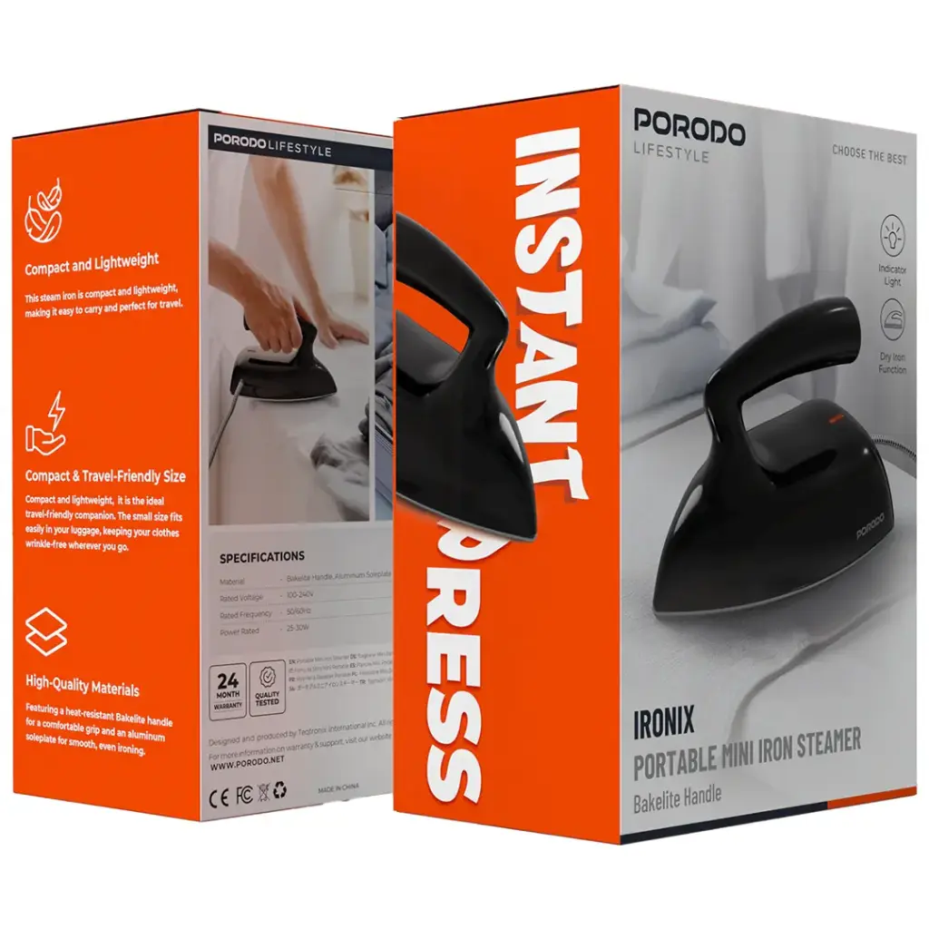 مكواة البخار الصغيرة المحمولة من بورودو لايف ستايل أيرونيكس بمقبض من الباكليت – باللون الأسود، مثالية لمن يحتاجون إلى كيّ سريع وفعّال بالبخار أثناء التنقل. تعمل هذه المكواة كجهاز خفيف الوزن وصغير الحجم، مزودة بمقبض من الباكليت يضمن استخدامًا آمنًا ومريحًا، وقاعدة من الألومنيوم توفر أداءً مثاليًا في الكيّ بالبخار. يتميز الجهاز بتصميم محمول يسمح بفصل أجزائه لسهولة التنظيف، مما يجعله مناسبًا للسفر. يوفر الجهاز قدرة كيّ سريعة وموثوقة بفضل محركه الذي يعمل بسرعة 20000 دورة في الدقيقة وبقوة 75 واط. تُمكّنك مكواة البخار الصغيرة المحمولة من إزالة التجاعيد من قميصك أثناء تنظيفه، كما تُزيل التجاعيد من الأقمشة الرقيقة. تتضمن المكواة قاعدة مانعة للانزلاق، مما يُحسّن ثباتها أثناء الاستخدام. تُعدّ مكواة البخار الصغيرة رفيقًا مثاليًا للأنشطة اليومية والسفر، لأنها تُساعد في الحفاظ على ملابسك بمظهر أنيق وخالٍ من التجاعيد دائمًا.